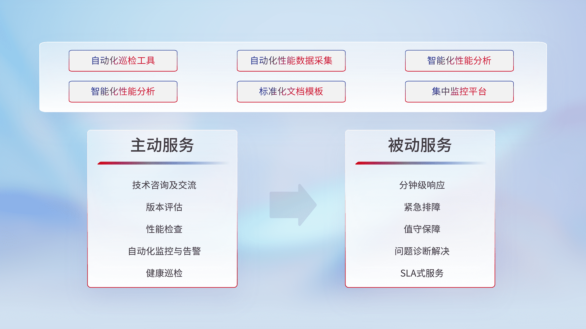 智能化工具和标准化文档,,,保障服务质量,,,,提供主动服务(包含技术咨询、、、版本评估、、、、性能检查、、、自动化监控与告警、、健康巡检)和被动服务包含(分钟级响应、、、紧急排障、、、值守保障、、、、问题诊断解决、、SLA服务)。。